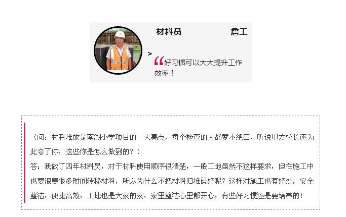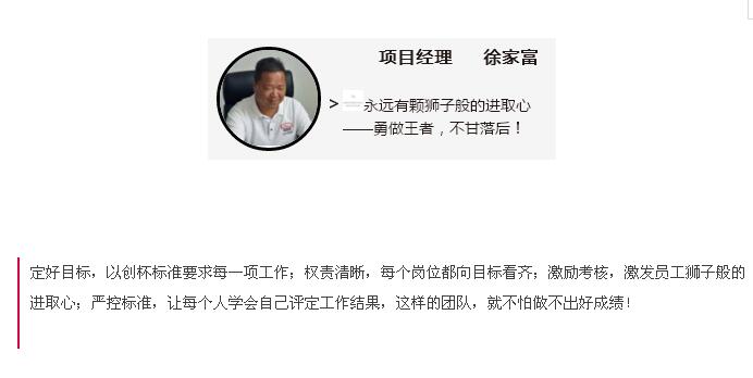 在7月份集團各施工項目的績效考核評結(jié)果中,南湖小學項目以90分的高分榮獲第一名的好成績!項目績效考評嚴格復雜,涉及質(zhì)量、安全、資料、管理等方方面面,能取得這樣的成績實屬不易,問起項目經(jīng)理徐家富項目取得高分的秘籍,他笑著說,讓每個人都有一顆獅子般的進取心,勇做王者,不甘落后,一切都能迎刃而解!近期,我們深入項目學習才發(fā)現(xiàn),成功絕對不是偶然,不僅項目經(jīng)理擁有一顆獅子般的雄心,項目中的每一個人都有一顆拼搏進取,不甘落后的心,使得他們對每一個細節(jié)的管理都嚴格按照標準,精益求精,方才成就今日的累累碩果!