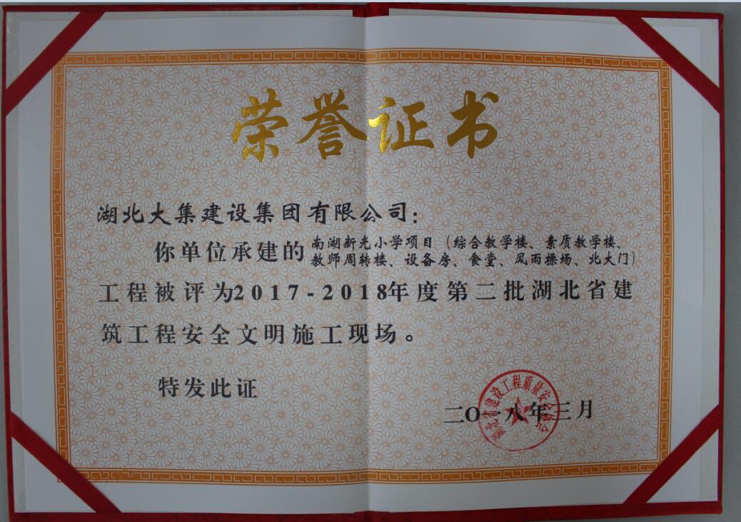 南湖新光小學(xué)項(xiàng)目(綜合教學(xué)樓、素質(zhì)教學(xué)樓、教師周轉(zhuǎn)樓、設(shè)備房、食堂、風(fēng)雨操場(chǎng)、北大門)工程被評(píng)為2017-2018年度第二批湖北省建筑安全文明施工現(xiàn)場(chǎng)(楚天杯);綜合教學(xué)樓工程被評(píng)為2016-2017年度第四批湖北省建筑結(jié)構(gòu)優(yōu)質(zhì)工程!