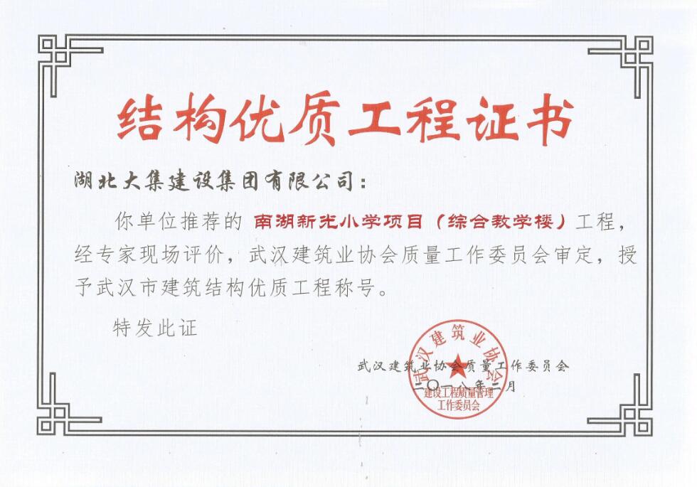 武漢市建筑結(jié)構(gòu)優(yōu)質(zhì)工程證書