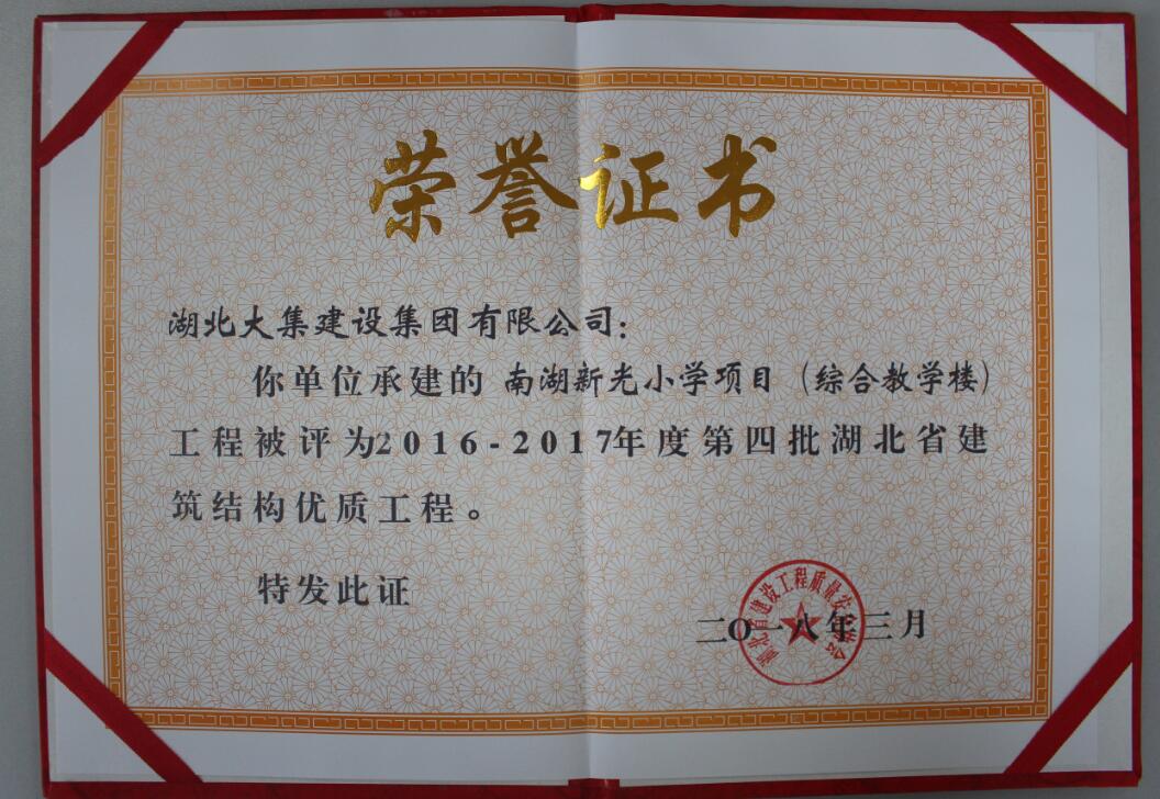 湖北省建筑結(jié)構(gòu)優(yōu)質(zhì)工程榮譽(yù)證書