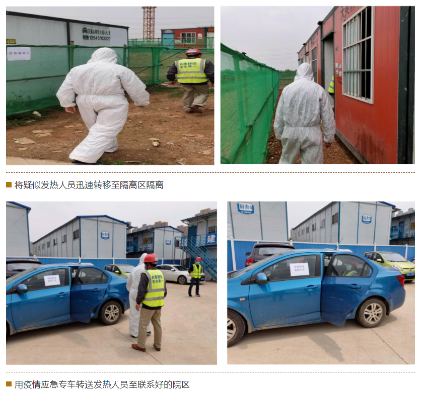 本次演練現(xiàn)場模擬一例疑似發(fā)熱患者,從被發(fā)現(xiàn)到應(yīng)急處理的全過程。演練內(nèi)容包括情況上報、項目應(yīng)急預(yù)案啟動、緊急隔離、送醫(yī)、現(xiàn)場消毒等環(huán)節(jié)。整個演練過程緊張有序、防疫物資標(biāo)準(zhǔn)齊全、保障到位,參加演練人員反應(yīng)迅速、配合默契、職責(zé)明確,達(dá)到了預(yù)期效果。