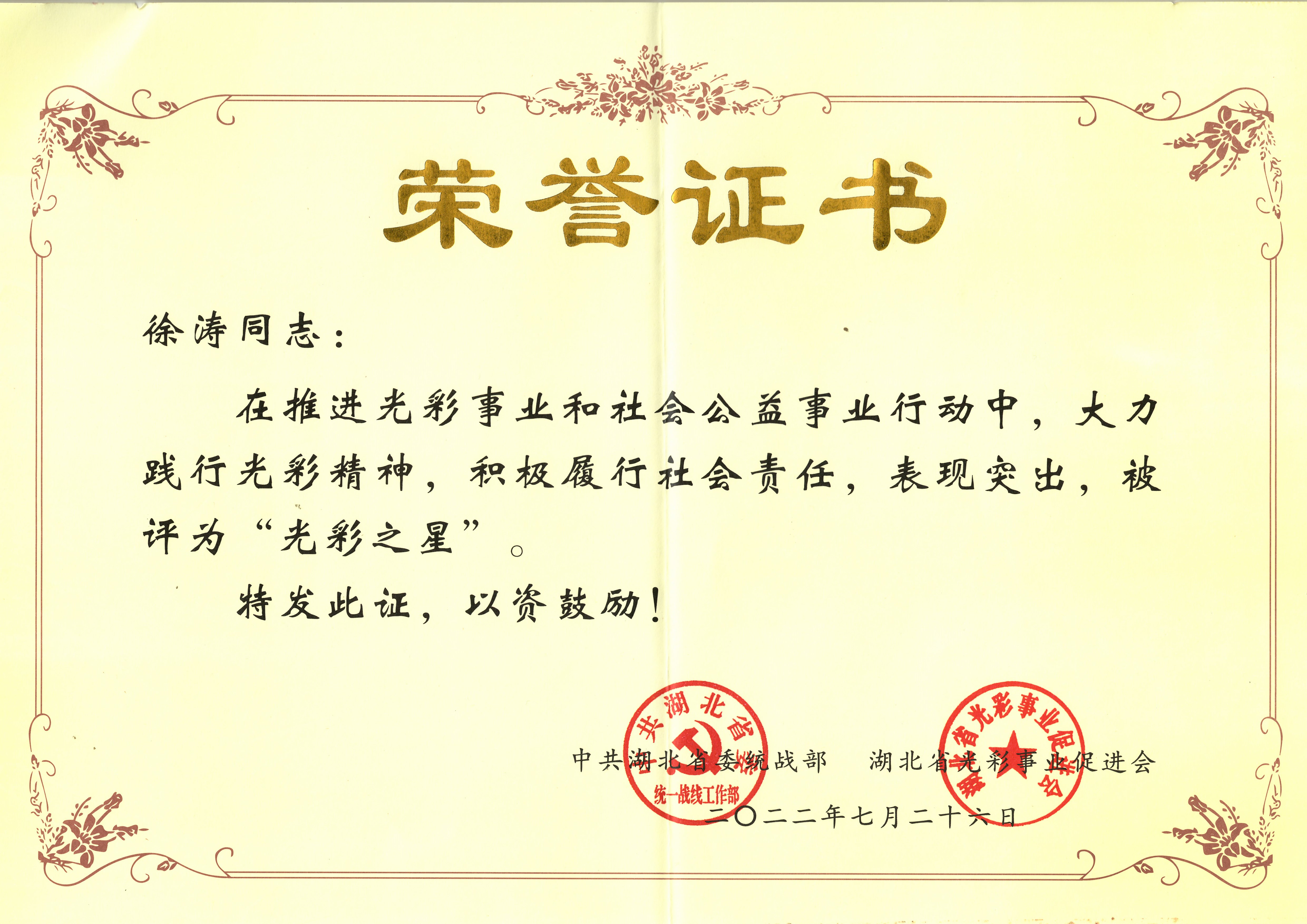 近日,由中共湖北省委統(tǒng)戰(zhàn)部、省光彩事業(yè)促進(jìn)會(huì)共同評(píng)選60名民營(yíng)經(jīng)濟(jì)人士“光彩之星”表彰會(huì)在恩施召開。會(huì)議表彰了一批熱心公益事業(yè)、積極回報(bào)社會(huì)的優(yōu)秀非公有制經(jīng)濟(jì)人士,湖北大集建設(shè)集團(tuán)有限公司董事長(zhǎng)、武漢閱景匯投資發(fā)展有限公司董事長(zhǎng)徐濤榮獲全省“光彩之星”榮譽(yù)稱號(hào)!